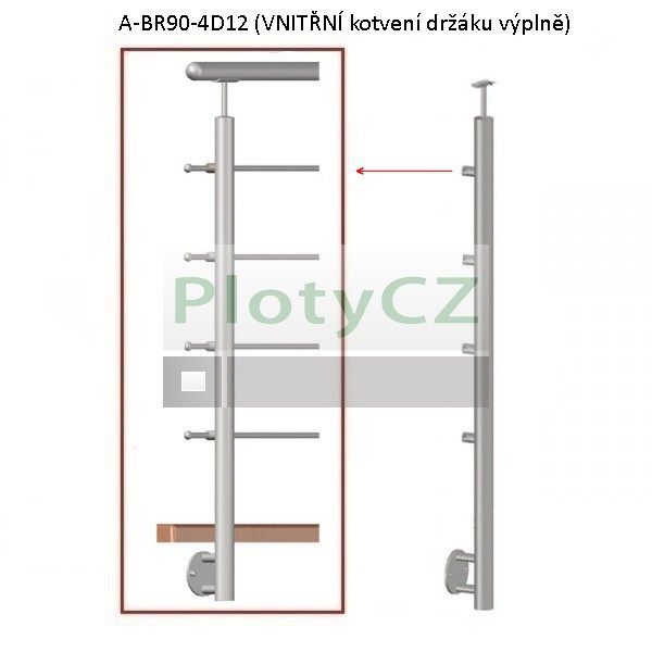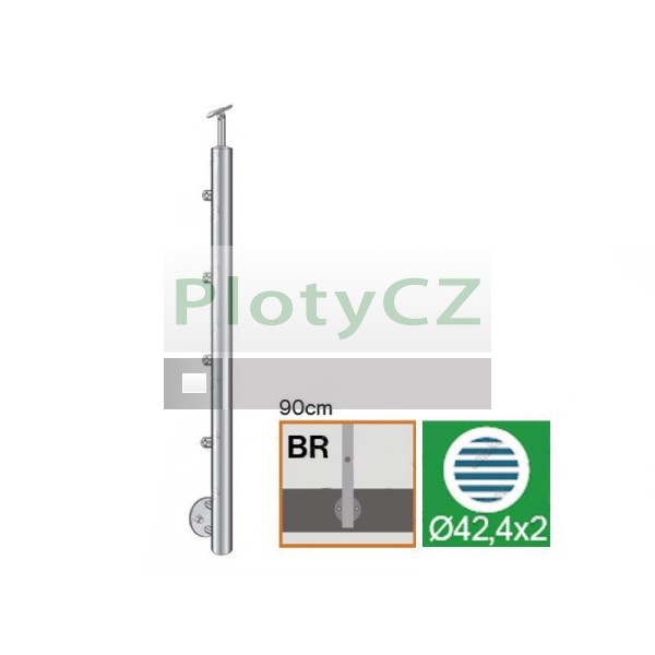 Nerezový sloupek D42,4mm pro madlo D42,4mm, boční kotvení, materiál AISI 304 brus K320, horizontální výplň 4 x d12mm. Určeno pro rovné zábradlí výšky 90 cm, pro montáž s max. přepadem do 3 m. Možnost nastavení sklonu výplně a madla.