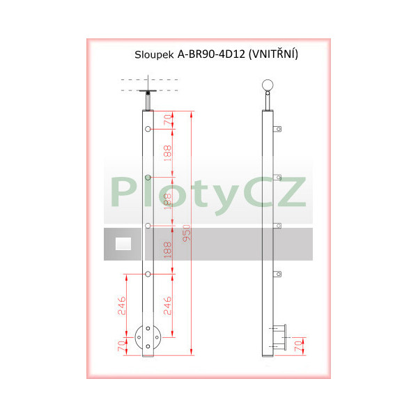 Nerezový sloupek D42,4mm pro madlo D42,4mm, boční kotvení, materiál AISI 304, brus K320, horizontální výplň 4 x d12mm, průběžný.