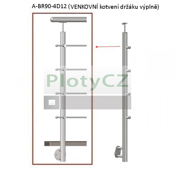Nerezový sloupek D42,4mm pro madlo D42,4mm, boční kotvení, materiál AISI 304 brus K320, horizontální výplň 4 x d12mm. Určeno pro rovné zábradlí výšky 90 cm, pro montáž s max. přepadem do 3 m. Možnost nastavení sklonu výplně a madla.