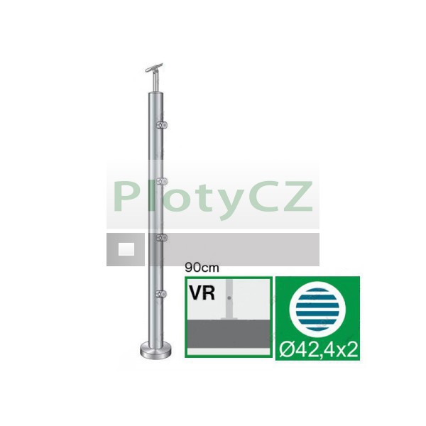 Nerezový sloupek D42,4mm pro madlo D42,4mm, vrchní kotvení, materiál AISI 304 brus K320, horizontální výplň 4 x d12mm. Určeno pro rovné zábradlí výšky 90 cm, pro montáž s max. přepadem do 3 m. Možnost nastavení sklonu výplně a madla.